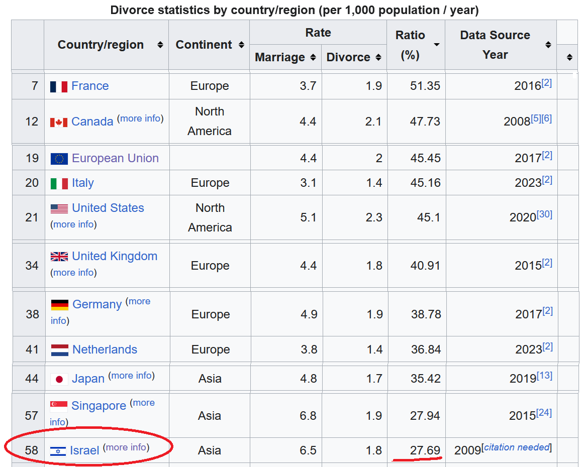 35.56% is certainly higher than the Dati rate, but still lower than almost every developed country, except Japan (divorce rate 35.42%). Japan is weird, right? That’s it. The mimetic effect of low-divorce Haredis, and Datis, is strong enough to produce a weirdly low divorce rate in Secular Israelis…