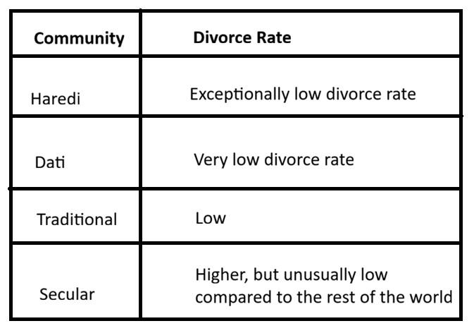 Haredi Jews (the ultra-orthodox) have exceptionally low divorce rates wherever they live. For any reason that a married couple might cite for divorce, Haredi society will counter it with a better reason to stay married. Thing is, in Israel, there are other religious communities - less religious than Haredi - who draw inspiration from the Haredi and are influenced by them. These communities, like the Dati, provide a one-way channel of influence between Israeli Haredi and the rest of Israeli society, a sort of valve in which Haredi marriage/divorce memes can spread outwards, without allowing pro-divorce memes inwards1.