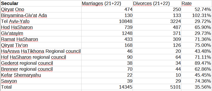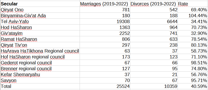 Let’s now see the table of divorce rates for overwhelmingly (more than 70% of households) Secular administrative units.