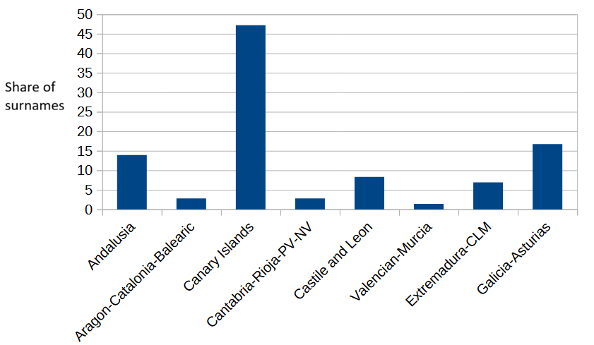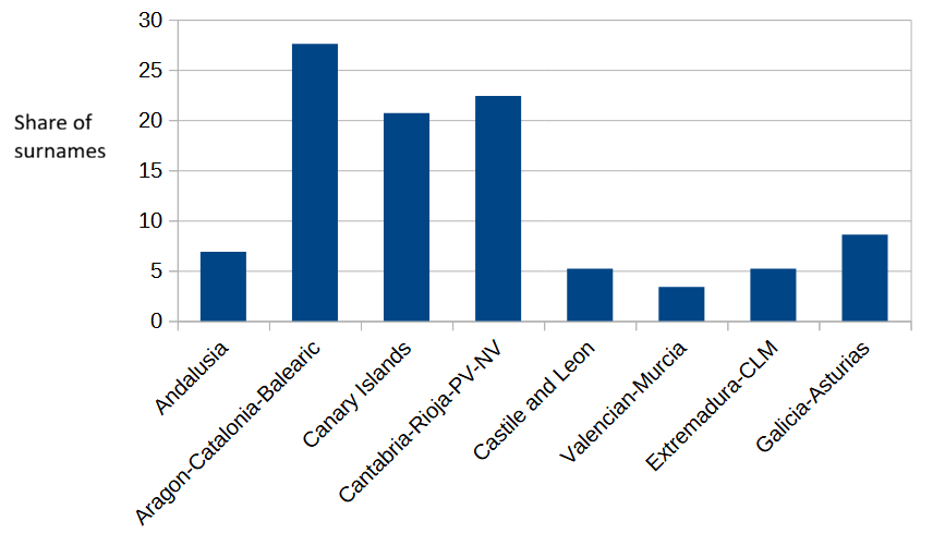 The share of surnames from Andalusia, the Canary Islands and Galicia-Asturias decrease substantially, compared to the general population. Other regions show smaller decreases or increases, or their share is so small that any change might just be noise.