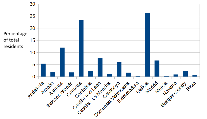 The following bar chart shows the percentage of Spanish nationals residing in Cuba in the year 2010 by region of birth. Mind you, this is not a perfectly representative sample of 20th century Spanish migration to Cuba, being obviously skewed towards the 1940s and 1950s rather than the more significant early 20th century, and likely including a substantial number of young expats.
